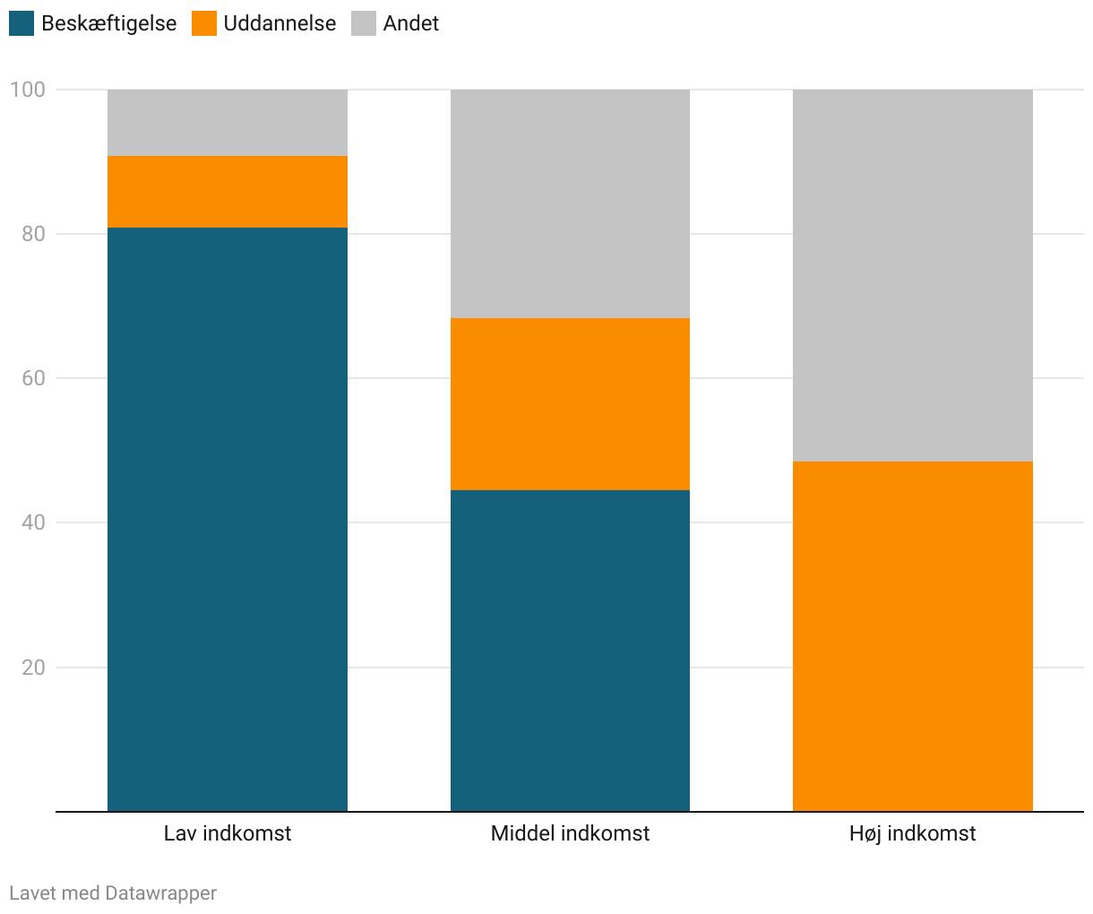 Note: Figuren viser, hvor stor en andel af sammenhængen mellem børns indkomst (som voksne) og deres forældres gennemsnitlige indkomst, der kan tilskrives forskelle i børnenes beskæftigelse (blå) og uddannelse (orange), alt efter om familierne havde lav indkomst (ca. 240.000 kr.), middel indkomst (ca. 530.000 kr.) eller høj indkomst (ca. 800.000 kr). Det grå areal angiver andelen af sammenhængen mellem børns og forældres indkomst, der ikke kan tilskrives forskelle i børnenes beskæftigelse og uddannelse. Indkomst måles som markedsindkomst (løn, profitter fra firmaer, kapitalindkomst mv.)