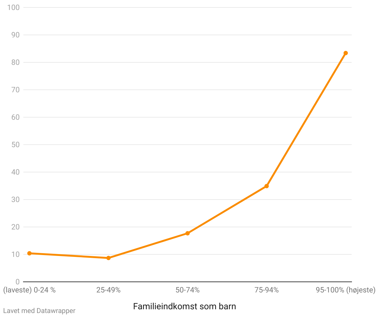 Note: Figuren viser, hvor stor en andel af sammenhængen mellem børns indkomst (som voksne) og deres forældres indkomst, der kan tilskrives forskelle i børnenes kapitalindkomst som voksne, alt efter forældrenes placering i indkomstfordelingen (på den vandrette akse - fra nederste 25% til øverste 5%).