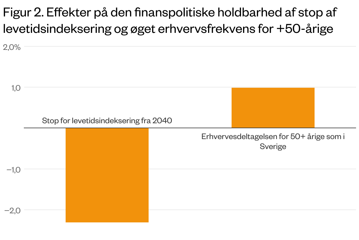 Samme muligheder for tidlig tilbagetrækning har man ikke haft i Sverige, og i en anden DREAM-beregning sammenligner bogens forfattere derfor erhvervsfrekvensen for personer over 50 år i Sverige og Danmark, for at måle den finanspolitiske effekt, hvis danskere over 50 år arbejdede i lige så høj grad som jævnaldrende svenskere. Dette ville øge den finanspolitiske holdbarhed med 1% af BNP og vil samtidig øge beskæftigelsen med ca. 60.000 personer frem mod 2045 (jf. figur 2).