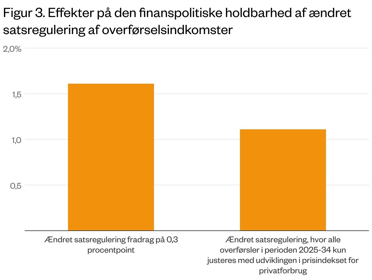 Det vil øge den finansielle holdbarhed med 1,1% af BNP. Dette greb vil dog også skabe stigende ulighed mellem lønmodtagere og modtagere af overførselsindkomster, og forfatterne har derfor beregnet dette for en midlertidig periode fra 2025-2034.
