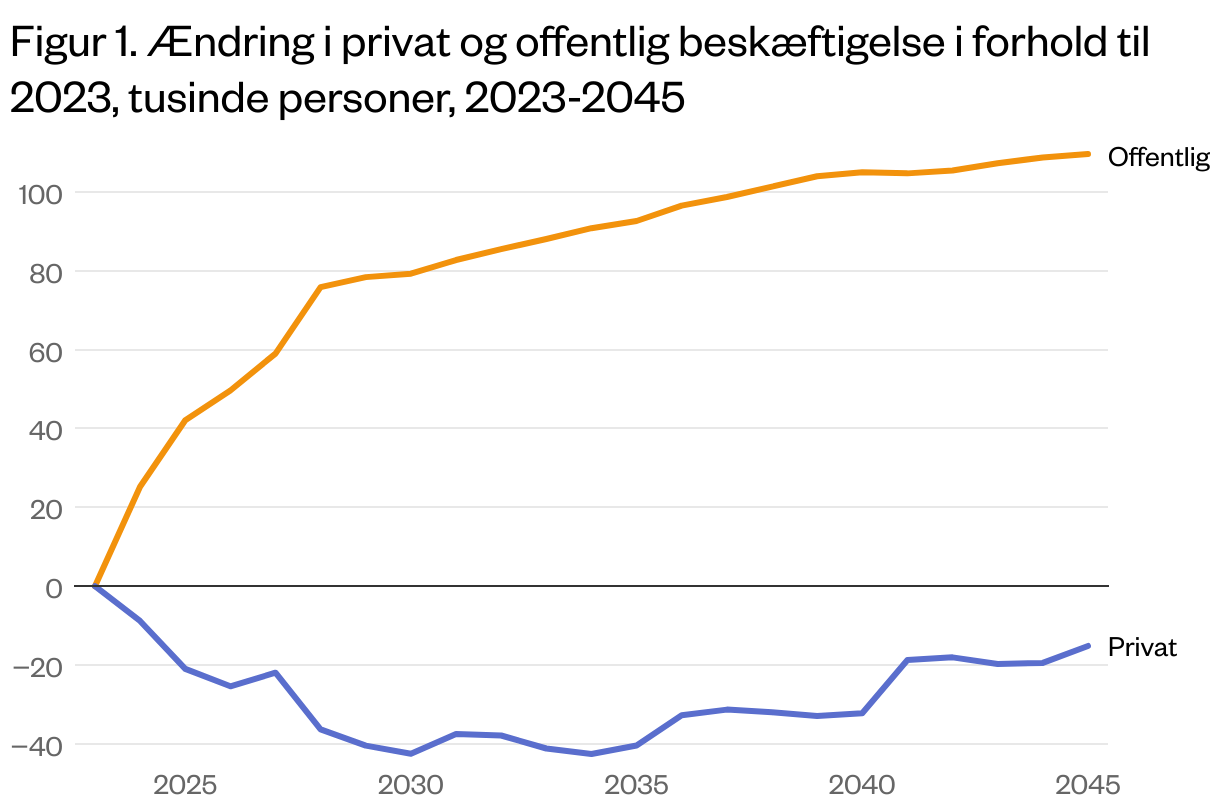 Og det i en arbejdsstyrke, som i samme periode kun forventes at stige med godt 47.000 personer. Dette vil uvægerligt føre til et betydeligt fald i den private beskæftigelse, der forventes at skrumpe med ca. 41.000 personer.