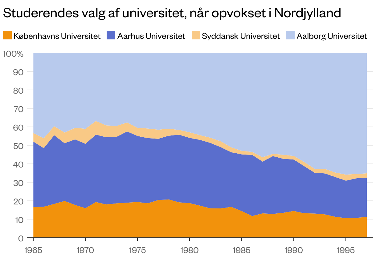 Figurnote: Mens unge fra provinsen gerne tager til hovedstaden for at studere, så tager unge fra Sjælland tilsyneladende stadig nødigt vestpå. Figurerne viser, hvor mange universitetsstuderende fra hvert geografisk område (årgangene 1965–1997), der har søgt ind på et af de fem universiteter i hovedstadsområdet KU, CBS, DTU, ITU eller RUC (orange), på Aarhus Universitet (blå), Syddansk Universitet (lys orange) eller Aalborg Universitet (lys blå). Kilde: Egne beregninger på data fra Danmarks Statistik