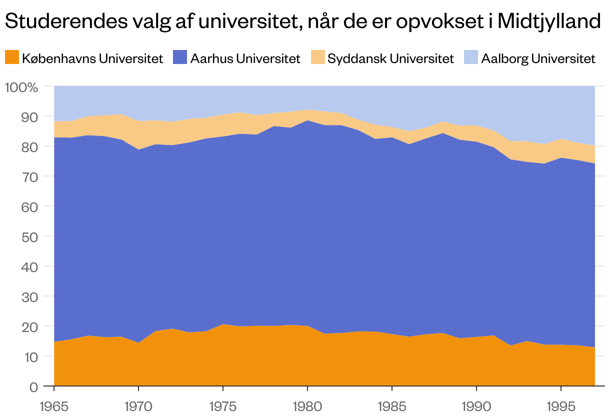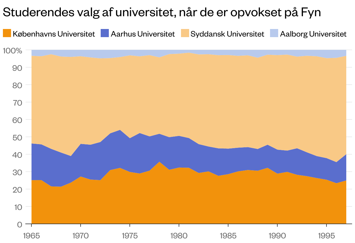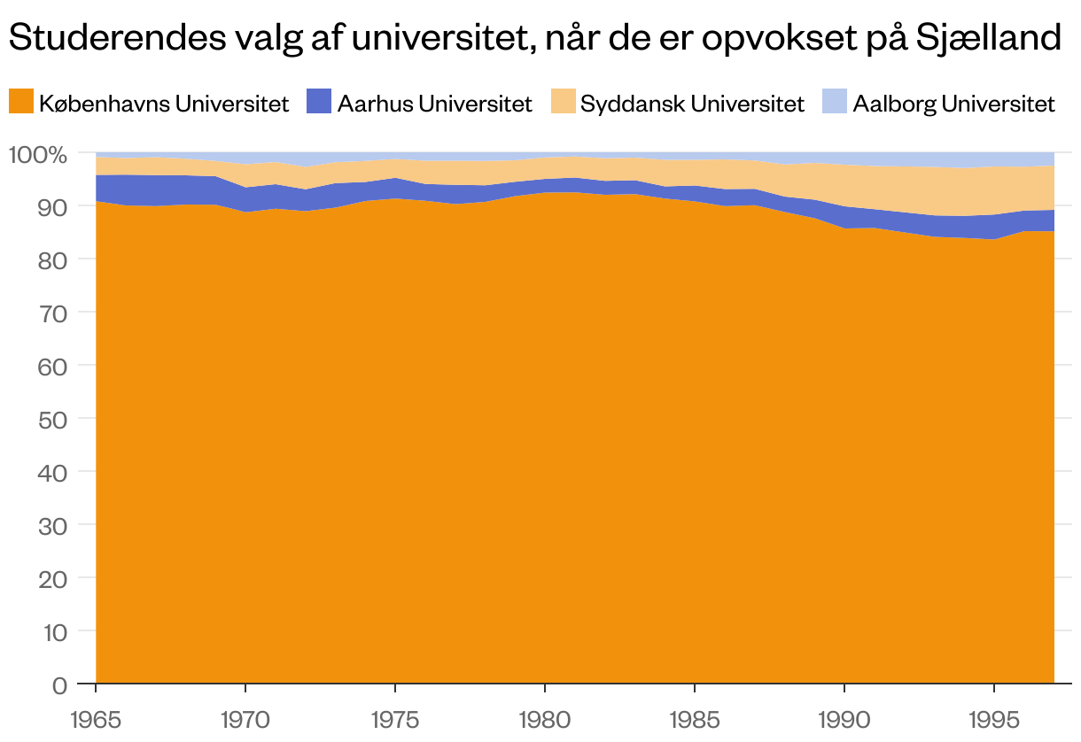 Unge, der vokser op på Sjælland, vælger derimod næsten altid et universitet i hovedstadsområdet – meget få sjællandske studerende rejser vest over Storebælt for at få en universitetsuddannelse. En tendens der har været konstant på tværs af årgange født i 1960’erne, 1970’erne, 1980’erne og
