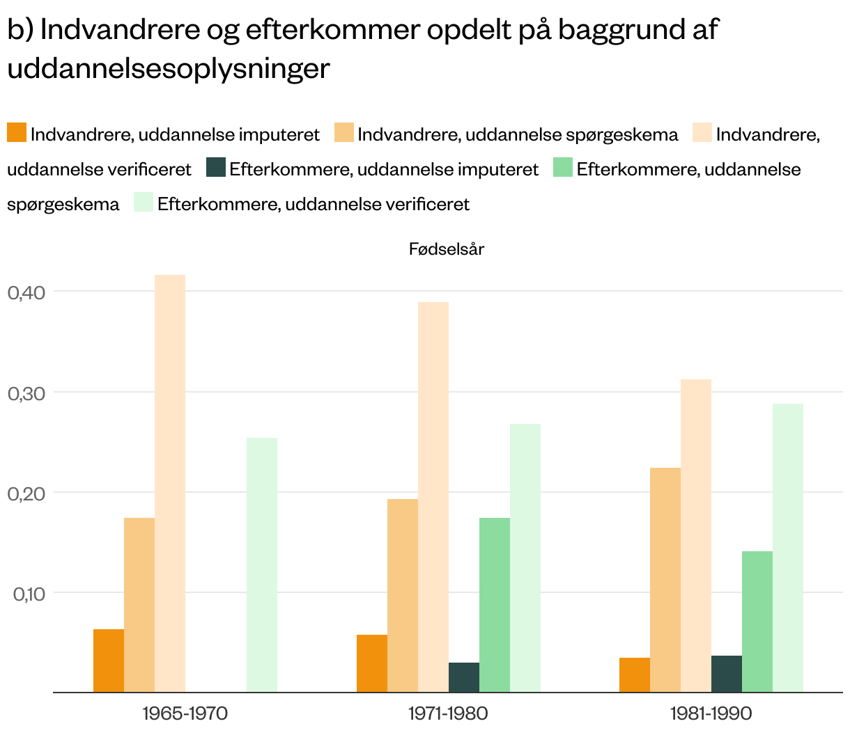 Note: Figuren viser den estimerede sammenhæng mellem børns og forældres uddannelseslængde afhængigt af børnenes fødselsårgang og oprindelse. I figuren svarer 1 på y-aksen til, at børns uddannelse er helt bestemt af forældres uddannelse, og 0 på y-aksen svarer til, at forældres uddannelse ikke har nogen betydning for børns uddannelse. Figur a) viser resultaterne for danskere (blå søjler), indvandrere (orange søjler) og efterkommere (grønne søjler). Figur b) viser resultaterne for indvandrere og efterkommere opdelt på kilden til uddannelsesoplysninger: approksimeret (blå søjler), spørgeskemaer (orange søjler), og verificeret (grønne søjler). Figuren viser resultater separat for årgange født i 1965-1970, 1971-1980 og 1981-1990.