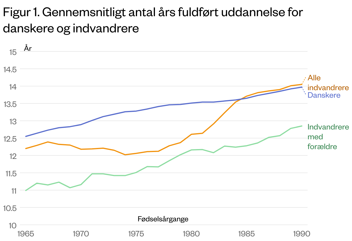 Note: Figuren viser de gennemsnitlige antal års fuldført uddannelse for årgange født fra 1965 til 1990. Den blå linje viser uddannelse for danskere. Den orange linje viser uddannelse for alle indvandrere, der var i Danmark som 30-årige. Den grønne linje viser uddannelse for indvandrere, hvor deres forældre også bor i Danmark.