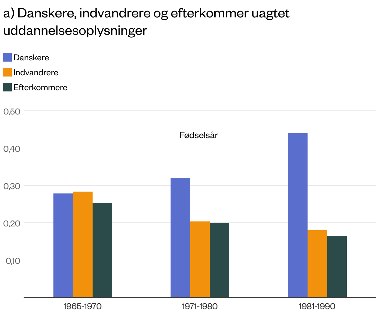 Figur 2 viser den sociale arv i uddannelse for danskere, indvandrere, der er kommet til Danmark som børn, og efterkommere blandt årgange født i hhv. 1965-70, 1971-80 og 1981-90. Den sociale arv i uddannelse udregnes som sammenhængen mellem børns og forældres års fuldført uddannelse, og kan fortolkes som den del af ulighed blandt børns uddannelse, der kan forklares med forskelle i forældrenes uddannelse. Her indikerer et højere estimat, at den sociale arv er højere.