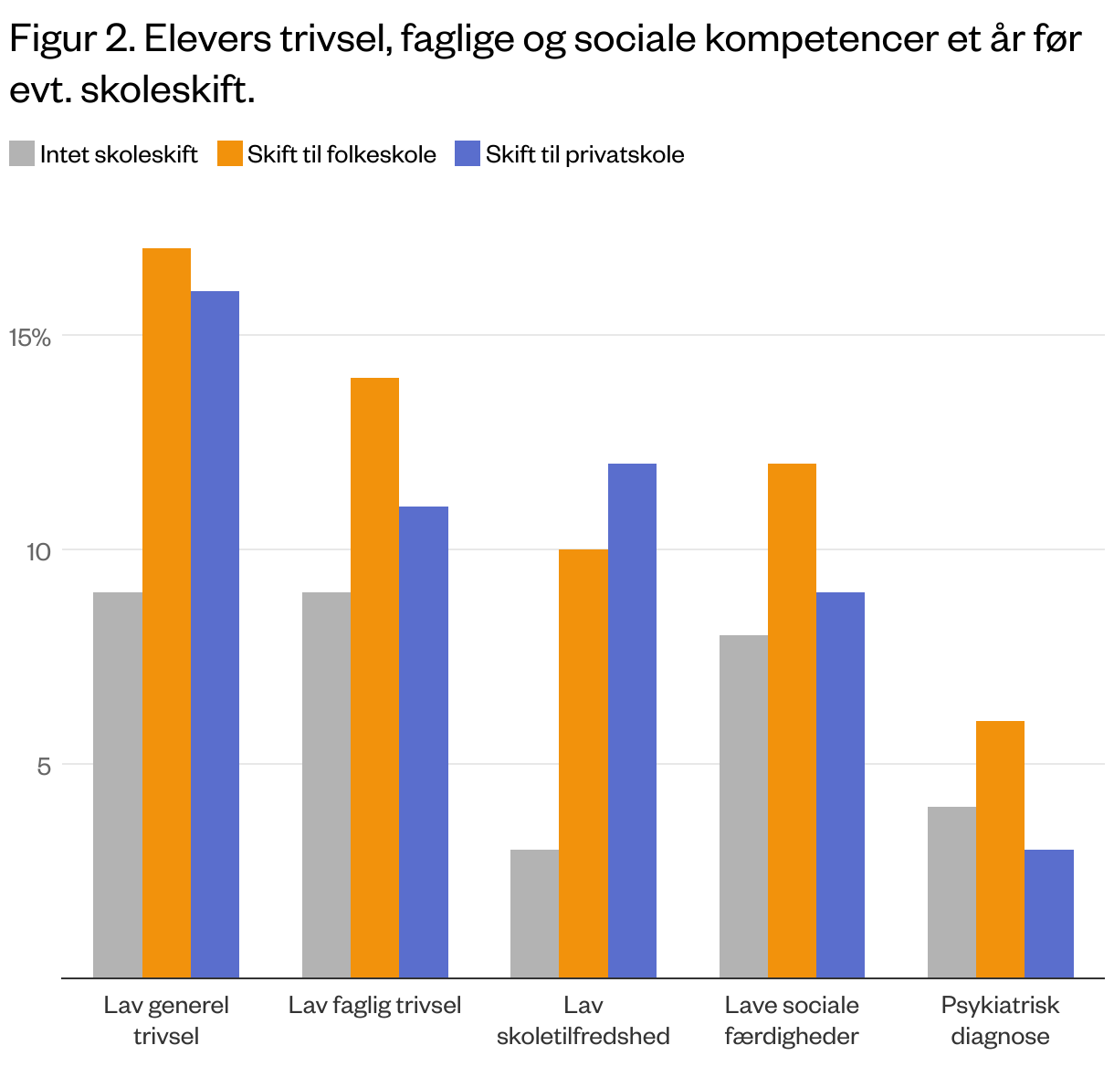 Figur 2 viser andelen elever med hhv. lav generel trivsel (her måles trivsel både i og udenfor skolen), lav tilfredshed med skolen, lav faglig trivsel og andelen med psykiatriske diagnoser fordelt efter skoleskift/intet skoleskift samt type af ny skole, som eleven skifter til. Elever, der skifter til privatskoler, er mindre tilfredse med deres skole men har bedre faglig trivsel og sociale færdigheder samt færre psykiatriske diagnoser, end elever, der skifter til andre folkeskoler. Bemærk, at ingen af de tre grupper inkluderer skoleskift til specialskoler eller efterskoler