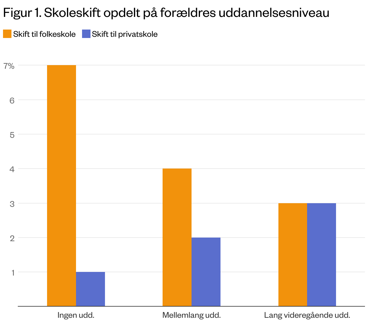 · For det første bekræfter analysen, at der er sociale forskelle i skiftet til privatskolerne; Elever med højtuddannede forældre skifter langt oftere skole til en privatskole end til en folkeskole.