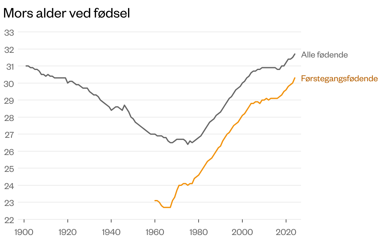 Note: Figuren viser mors gennemsnitlige alder ved fødsel (1901-2024) og ved første fødsel (1960-2024). I starten af det 20. århundrede var gennemsnitsalderen for fødende kvinder tæt på samme niveau som i dag, hvorimod den så sit laveste niveau i starten af 1970erne. Kilde: Danmarks Statistik.