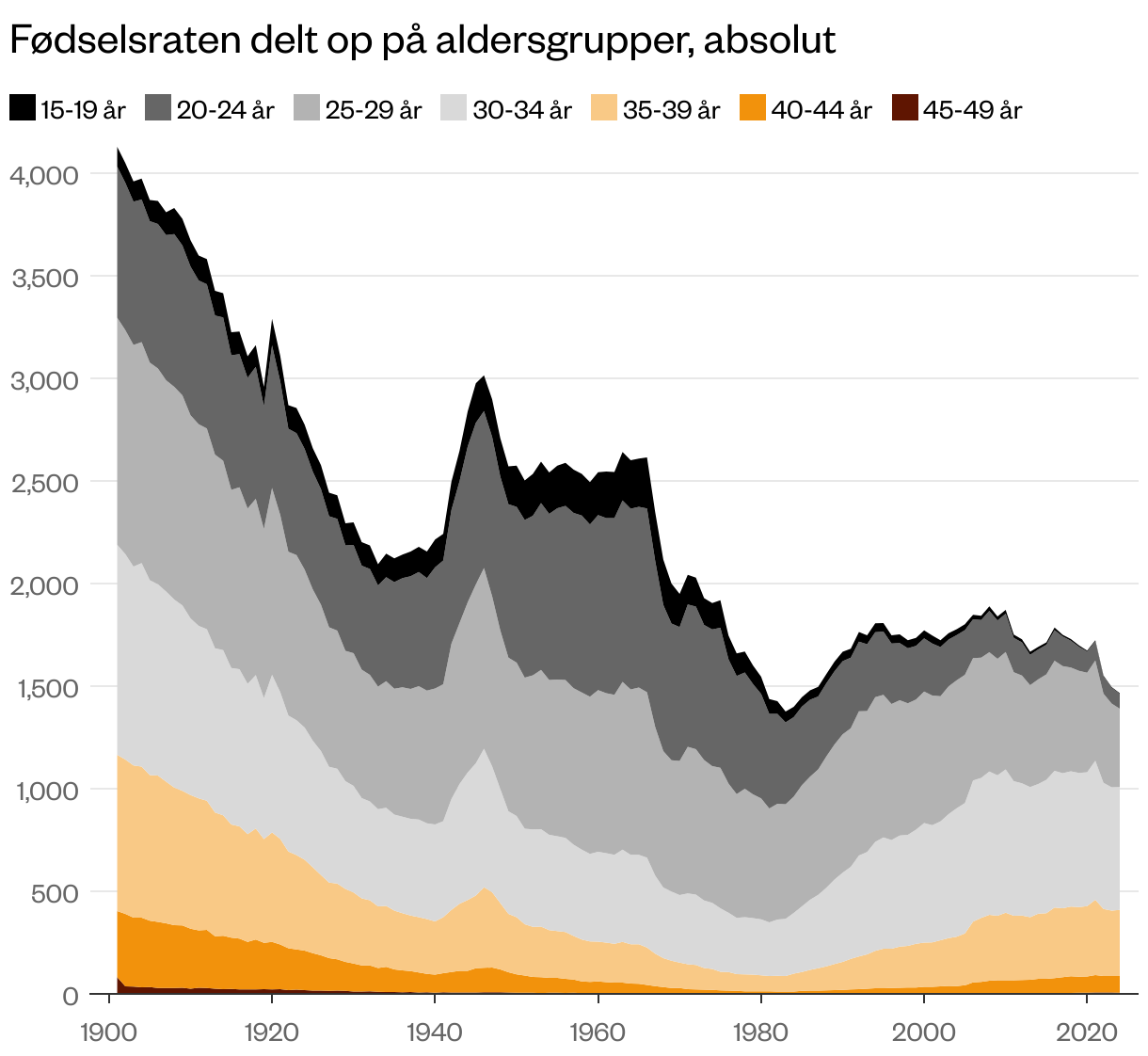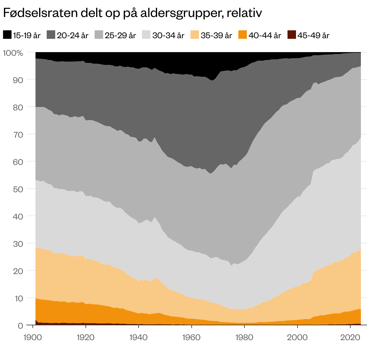 Som figuren nedenfor demonstrerer, har der været store udviklinger i hvilke aldersgruppe, der fødte børnene i Danmark hen over de seneste 125 år. På tværs af årene har kvinder mellem 25-34 år altid stået for over halvdelen af fødslerne et givent år, og i 2024 tegnede de sig for 2/3 af alle fødsler. Den største forandring over de 125 år er faldet i andelen af fødsler hos kvinder i alderen 20-24. I 1901 tegnede den gruppe sig for 18% af fødslerne, og i slutningen af 1960’erne kort før p-pillens indførsel, for omkring 34%. I 2024 stod de kun for 5% af fødslerne, og der er nu en større andel af fødsler blandt kvinder over 40 år end for kvinder under 25 år. Fødsler til mødre i teenage-årene var aldrig et stort fænomen, men så dog sit relative højdepunkt i slutningen af 1960’erne, hvor op til 10% af alle fødsler var af kvinder under 20 år. I 2024 var der tale om 0,2% af alle fødsler. Den lave andel af mødre i alderen over de 34 år var i høj grad et fænomen, der primært gjorde sig gældende i årtierne fra 1950 til 1990. Men hvor det tidligere var drevet af , at kvinder i gennemsnit fik flere børn hen over livsbanen, er de seneste årtier i stedet nok præget af længere venten indtil første barn.