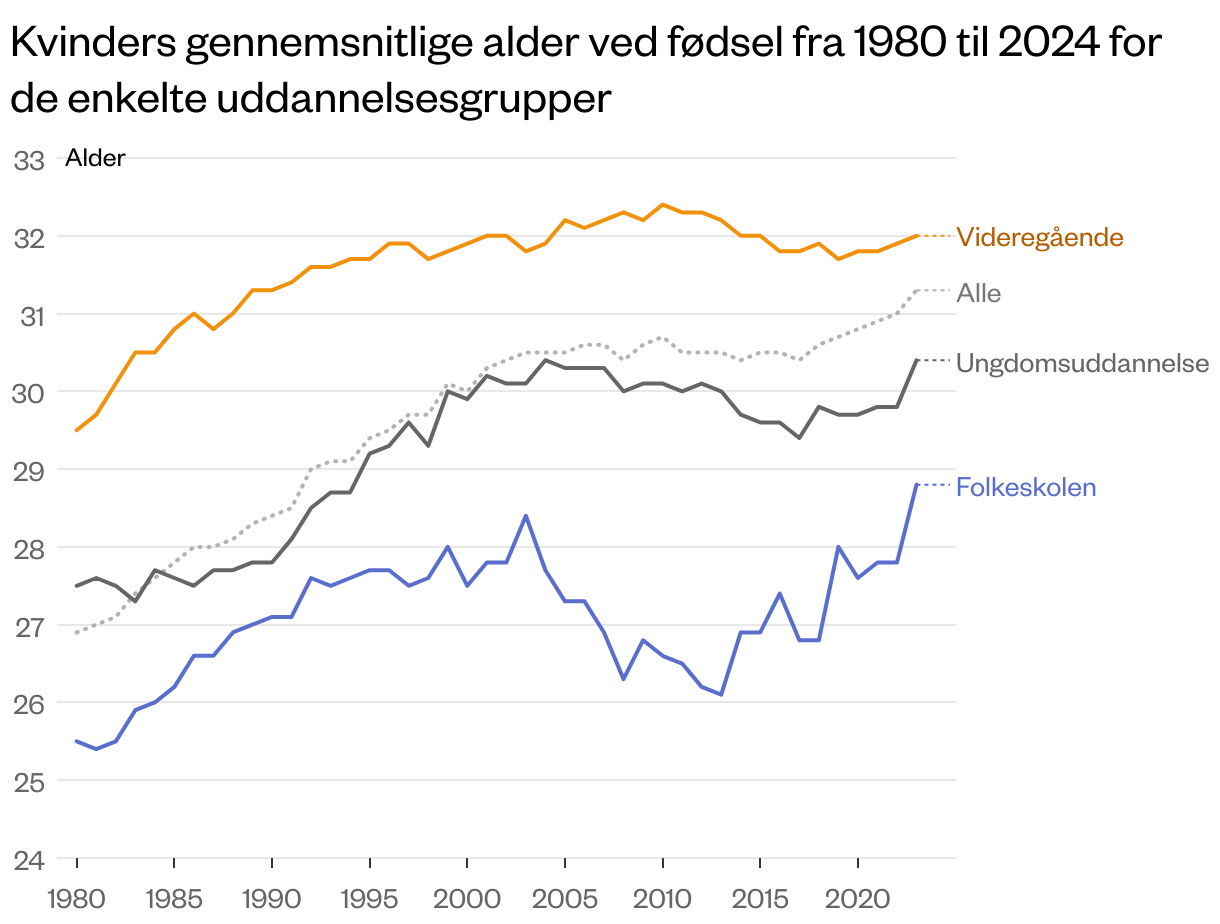 Mors alder begyndte for alvor at stige fra 1980, og gennemsnitsalderen for fødende kvinder steg med over fire år fra 1980 til 2024. Ændringen var langt hen ad vejen drevet af ændringer i uddannelsesadfærd. Perioden fra 1980’erne og frem så en drastisk ekspansion i kvinders uddannelsesopnåelse. I 1986 have 20% af kvinder mellem 25-29 en videregående uddannelse. I 2024 var den tilsvarende andel 60%, så der var tale om en tredobling. Uddannelse er en central parameter, fordi vejen igennem uddannelsessystemet er med til at strukturere folks livsbane—de fleste venter med at stifte familie, til de har færdiggjort deres uddannelse. Det kan også aflæses i figuren nedenfor, som både viser den gennemsnitlige alder for alle kvinder ved fødsel (stiplet linje) og udviklingen i gennemsnitsalder fordelt på mors uddannelsesniveau. Inden for uddannelsesgrupperne steg alder langt mindre end generelt. Så en af de primære grunde til at vi har set en stigning i alder ved fødsel siden 1980erne er, at kvinder har taget mere uddannelse, og det udsætter, hvornår de begynder at få børn.