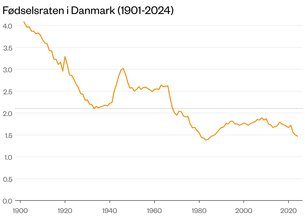 Note: Figuren viser udviklingen i fødselsraten i Danmark fra 1901 frem til 2024. Siden slutningen af 1960’erne har den danske fødselsrate konsekvent ligget under det såkaldte reproduktionsniveau på 2,1 barn per kvinde (stiplet line). Det har dog ikke stoppet den danske befolkning fra at vokse hen over hele perioden fra slut-1960erne og frem. Befolkningsvæksten har skyldtes en kombination af, at danskerne lever længere og længere samt en forholdsvis konsistent positiv nettoindvandring. Kilde: Danmarks Statistik.