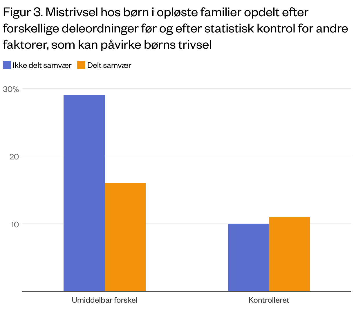 Men når forskerne igen tager højde for forskelle i familiernes sociale og økonomiske forhold og børnenes niveau af mistrivsel inden parforholdsophøret, kan de ikke konstatere statistiske signifikante forskelle i børns mistrivsel på tværs af forskellige deleordninger (Figur 3).