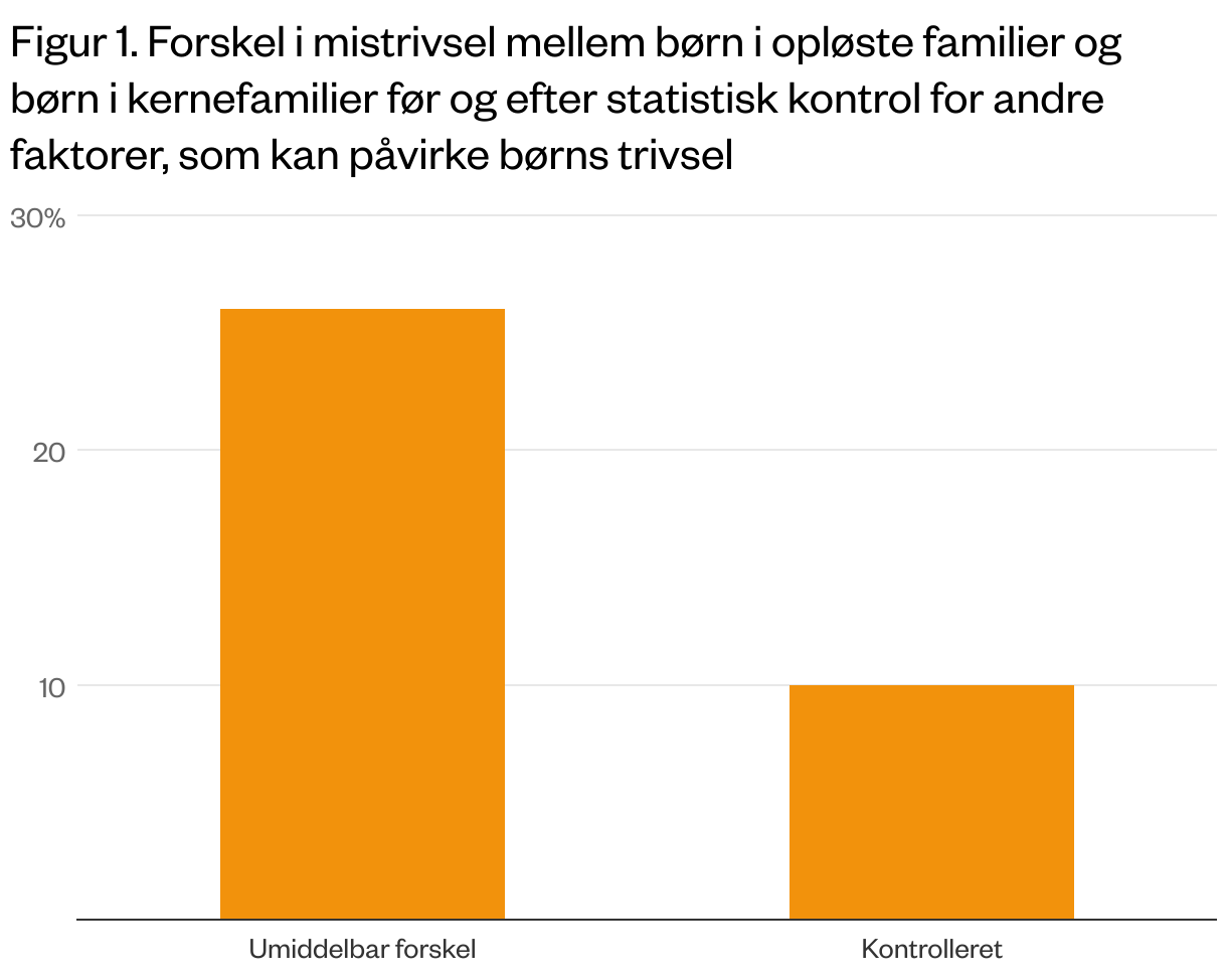 Men når forskerne tager højde for de økonomiske og sociale aspekter, som er overrepræsenteret blandt forældre, der går fra hinanden (som fx lavere indkomst, kortere uddannelse, højere risiko for domme for kriminalitet, m.v.) så er det tydeligt, at ca. 60% af forskellen i trivsel mellem børn i kernefamilier og børn i opløste familier skyldes andre forhold end forældrenes samlivsophør (Figur 1).