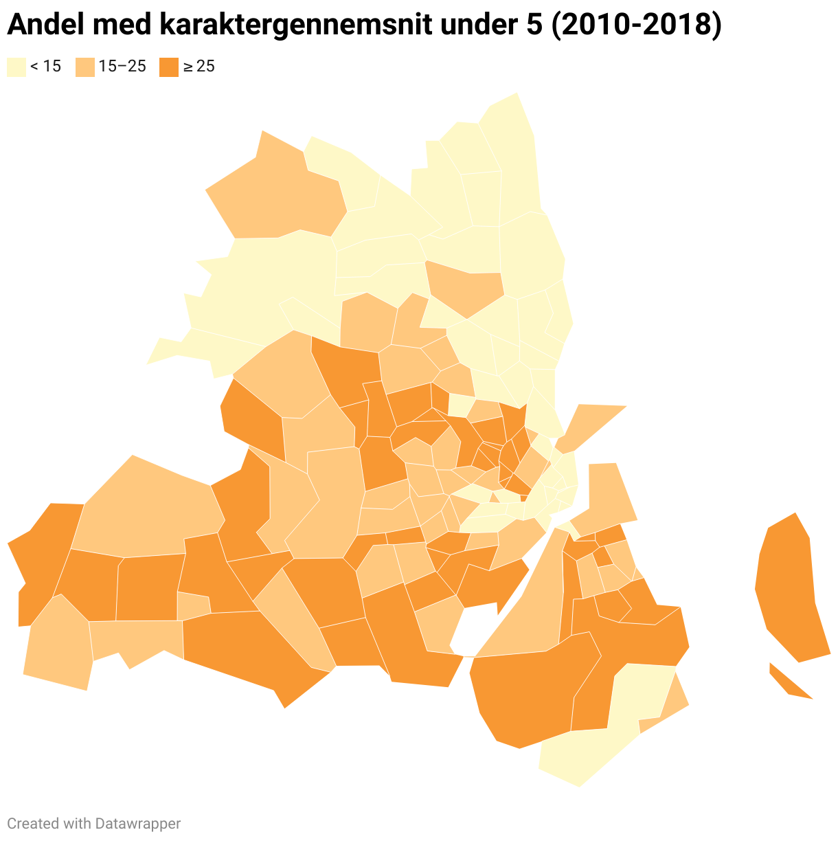 Forskellene ses inden for små geografiske områder. Eksempelvis har Sankt Thomas Sogn, der ligger på Frederiksbergsiden af Åboulevarden, ca. 13 procent med et karaktergennemsnit under 5, mens Bethlehem Sogn og Blågårdens Sogn, der grænser op til Sankt Thomas Sogn på Nørrebrosiden af Åboulevarden, har hhv. 27 og 30 procent med et karaktergennemsnit under 5.