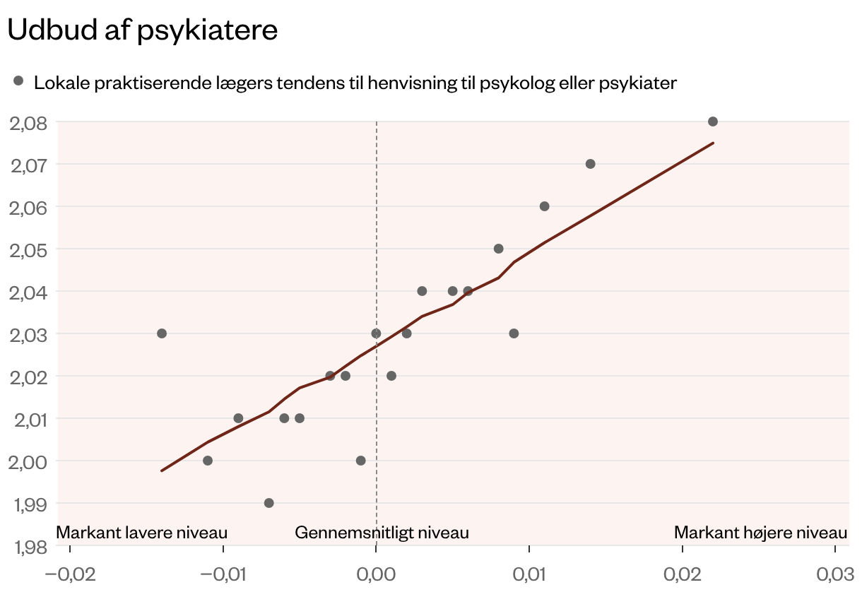 FIGURNOTE: Grafen viser sammenhængen mellem udbuddet af lokalt praktiserende psykiatere og de lokale praktiserende læges tendens til at behandle patienter med henvisning til netop en psykiater, hvor det lokale udbud varierer meget: I nogle kommuner er der 10 privatpraktiserende psykiatere pr. 10.000 borgere, mens andre kommuner slet ingen har. Y aksen måler (i omregnet form) forekomsten af lokalt praktiserende psykiatere i en kommune, mens 0 på x-aksen markerer det gennemsnitlige niveau for henvisning til psykiater for alle læger i undersøgelsen. Grafen viser dermed, at praktiserende læge ikke så ofte til psykiater i områder, hvor der er færre at henvise til. Forskerne har anvendt data for personer i alderen 18-80 år i perioden 1995-2019, og har kontrolleret for socioøkonomiske forskelle ved at tage højde for patienternes uddannelsesniveau. Kilde: Forskernes egne beregninger på tal fra Sundhedsdatastyrelsen / Danmarks Statistik