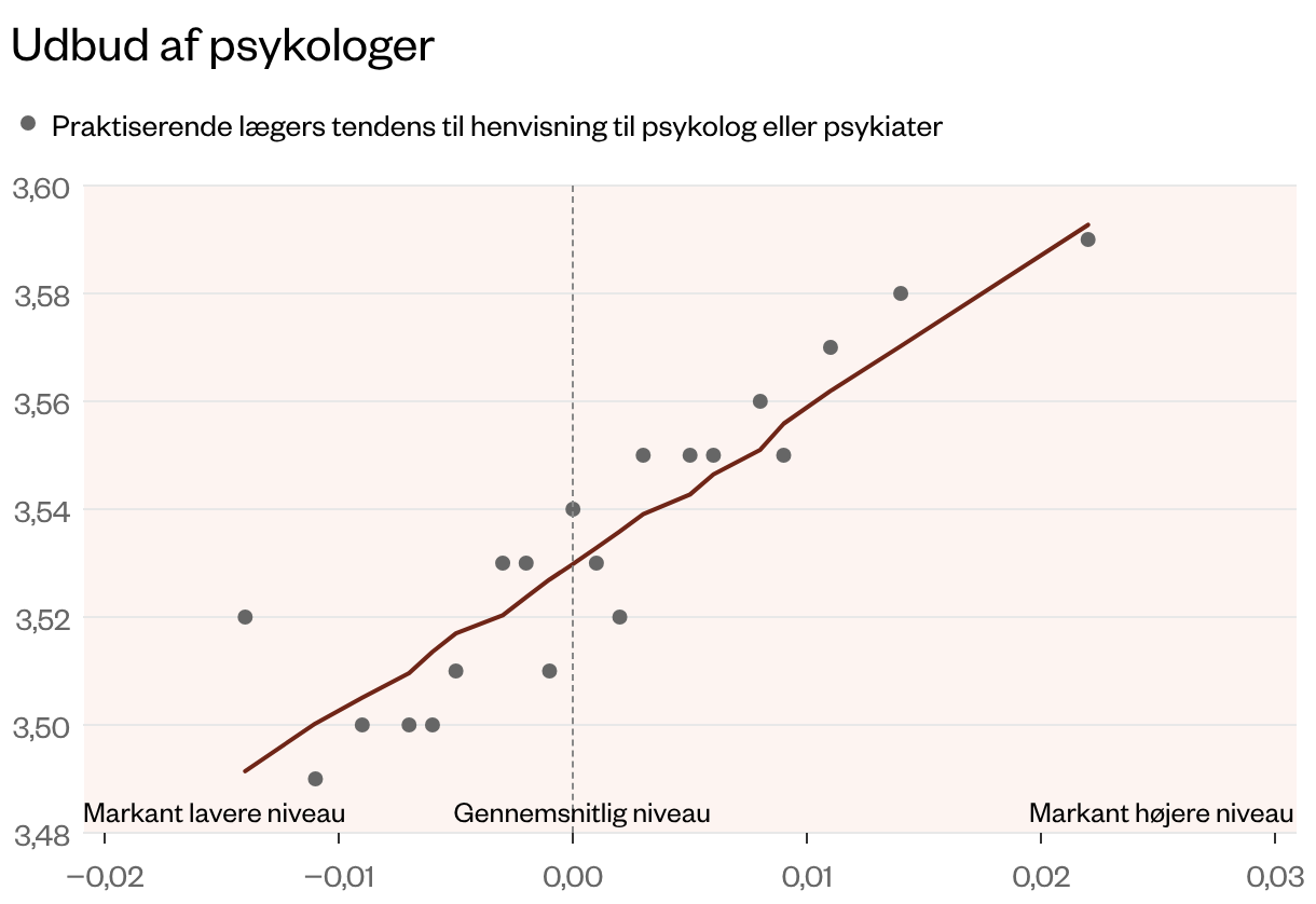 FIGURNOTE: Grafen viser sammenhængen mellem udbuddet af lokalt praktiserende psykologer og de lokale praktiserende læges tendens til at behandle patienter med henvisning til netop psykolog. Udbuddet af lokalt praktiserende specialister indenfor mentalt helbred varierer meget: I nogle kommuner er der 1 psykolog pr. 10.000 borgere, mens andre kommuner har op til 35 psykologer pr. 10.000 borgere. Y aksen måler (i omregnet form) forekomsten af lokalt praktiserende psykologer i en kommune, mens 0 på x-aksen markerer det gennemsnitlige niveau for henvisning til psykolog for alle læger i undersøgelsen. Grafen viser dermed, at praktiserende læge ikke så ofte til psykolog i områder med færre psykologer. Lægernes valgte behandling afhænger altså i høj grad af begrænsningerne i det lokale sundhedssystem. Forskerne har anvendt data for personer i alderen 18-80 år i perioden 1995-2019, og har kontrolleret for socioøkonomiske forskelle ved at tage højde for patienternes uddannelsesniveau. Kilde: Forskernes egne beregninger på tal fra Sundhedsdatastyrelsen / Danmarks Statistik