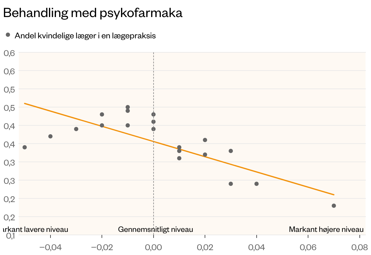 FIGURNOTE: Grafen her viser sammenhængen mellem den praktiserende læges køn og dennes tendens til at behandle patienter med psykofarmaka. Forskerne har her målt på, hvor stor en andel af lægerne i en lægepraksis, der er kvinder, og figuren viser, at jo flere kvindelige læger, der er ansat i en lægepraksis, des sjældnere bliver patienter med mentale helbredsproblemer behandlet med psykofarmaka. Y-aksen viser, hvor stor en andel af de ansatte læger i en praksis, der er kvinder, mens 0 på x-aksen markerer det gennemsnitlige niveau recepter på psykofarmaka for alle læger i undersøgelsen. Forskerne har anvendt data for personer i alderen 18-80 år i perioden 1995-2019, og har kontrolleret for socioøkonomiske forskelle ved at tage højde for patienternes uddannelsesniveau. Kilde: Forskernes egne beregninger på tal fra Sundhedsdatastyrelsen / Danmarks Statistik.