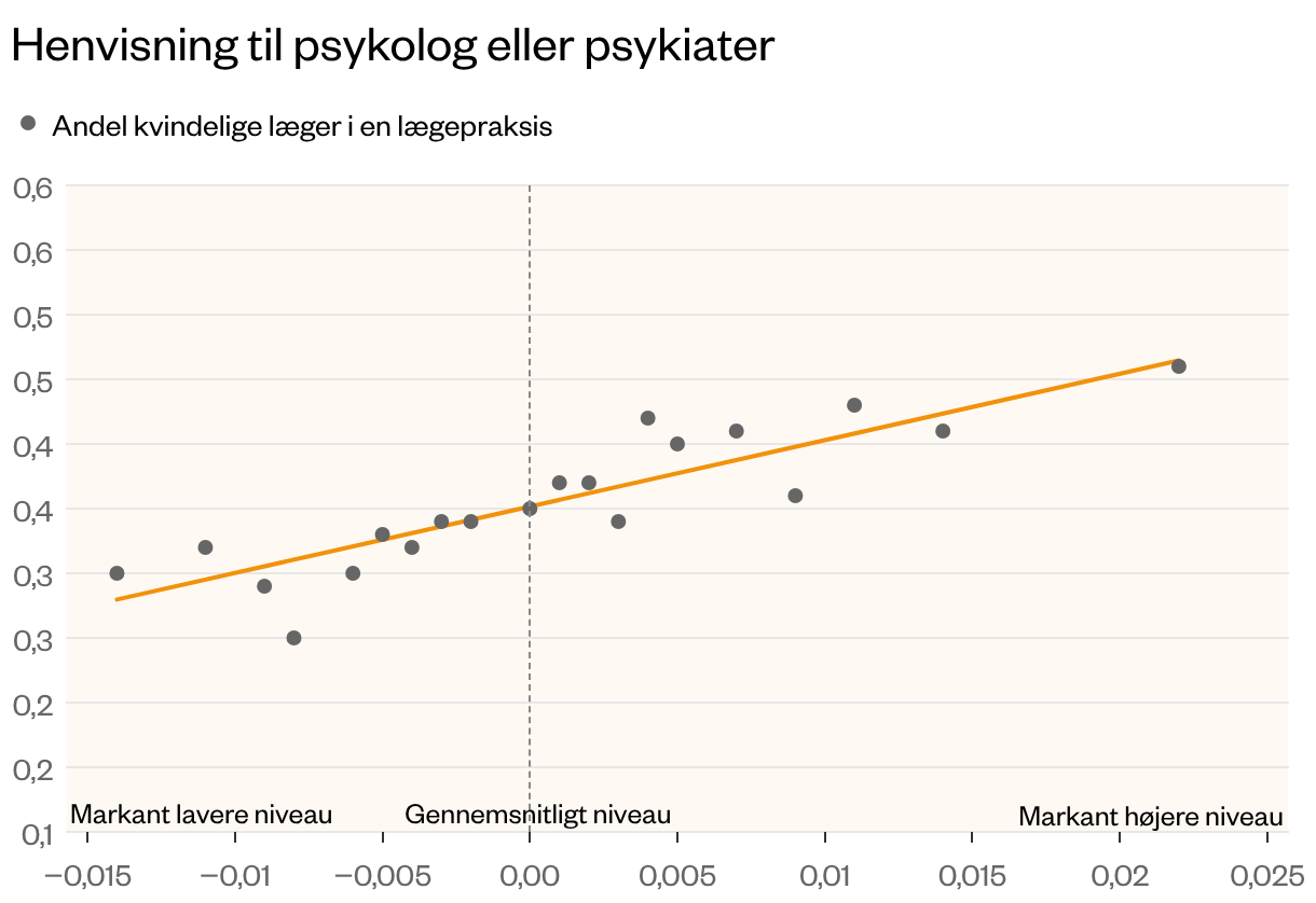 FIGURNOTE: Her ses omvendt, at jo flere kvindelige læger, der er ansat i en lægepraksis, des oftere modtager patienter med mentale helbredsproblemer en henvisning til psykolog eller psykiater. Y-aksen viser, hvor stor en andel af de ansatte i en lægepraksis, der er kvinder, mens 0 på x-aksen markerer det gennemsnitlige niveau for henvisninger til den type specialister for alle læger i undersøgelsen. Forskerne har anvendt data for personer i alderen 18-80 år i perioden 1995-2019, og har kontrolleret for socioøkonomiske forskelle ved at tage højde for patienternes uddannelsesniveau. Kilde: Forskernes egne beregninger på tal fra Sundhedsdatastyrelsen / Danmarks Statistik.
