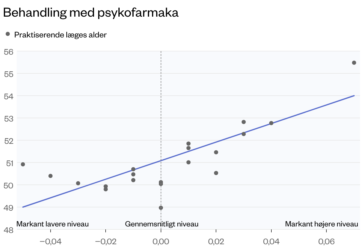 FIGURNOTE: Graferne viser sammenhængen mellem den praktiserende læges alder og lægens tendens til at behandle patienter med psykofarmaka. Y- aksen viser lægens alder. 0 på x-aksen markerer det gennemsnitlige niveau for hhv. recepter på psykofarmaka for alle læger i undersøgelsen. Figuren viser, at jo ældre en læge er, des oftere behandler lægen patienter med mentale helbredsproblemer med psykofarmaka. Forskerne har anvendt data for personer i alderen 18-80 år i perioden 1995-2019, og har kontrolleret for socioøkonomiske forskelle ved at tage højde for patienternes uddannelsesniveau. Kilde: Forskernes egne beregninger på tal fra Sundhedsdatastyrelsen / Danmarks Statistik.
