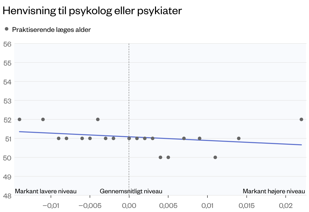 FIGURNOTE: Grafen viser sammenhængen mellem den praktiserende læges alder og lægens tendens til at behandle patienter med henvisning til psykolog eller psykiater. Y-aksen viser lægens alder. 0 på x-aksen markerer det gennemsnitlige niveau for henvisninger til specialist for alle læger i undersøgelsen. Lægens tendens til at henvise patienter med mentale helbredsproblemer til psykolog eller psykiater er dog også påvirket af det lokale udbud af netop den type specialister. Forskerne har anvendt data for personer i alderen 18-80 år i perioden 1995-2019, og har kontrolleret for socioøkonomiske forskelle ved at tage højde for patienternes uddannelsesniveau. Kilde: Forskernes egne beregninger på tal fra Sundhedsdatastyrelsen / Danmarks Statistik