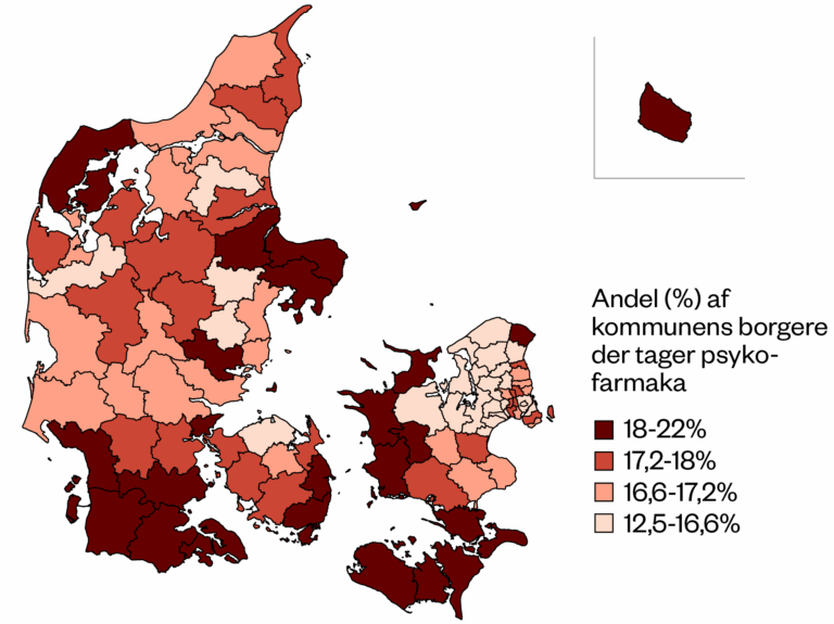 Kortet til venstre viser, hvor mange af borgerne i en kommune pr år, der i gennemsnit modtager medicinsk behandling mod mentale helbredsproblemer, hvor mørke farver viser et højere forbrug psykofarmaka. Andelen af borgere, som tager psykofarmaka, afhænger i høj grad af befolkningssammensætningen, da kvinder har et højere forbrug af psykofarmaka end mænd, og ældre et højere forbrug end yngre mennesker.