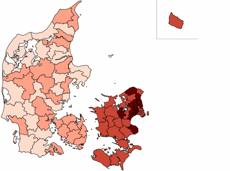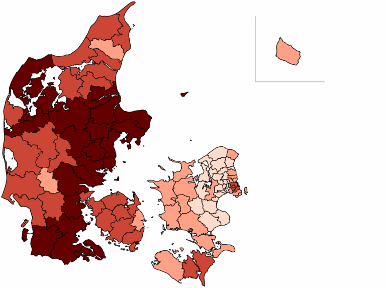 I kortet til højre har forskerne kun sammenlignet brugen af henvisninger mellem patienter med samme køn, alder, socioøkonomiske karakteristika og fysisk sundhed (kroniske sygdomme) mm. Kortet viser dermed, hvor de praktiserende lægers tendens til at henvise til psykolog/psykiater er højere. Dermed kan forskellen mellem kommunerne primært forklares af, at lægerne her har en særlig præference for at henvise til specialister. Men udbuddet af lokalt praktiserende psykologer og psykiatere spiller også ind på lægernes tendens til at henvise til specialister. Forskerne har anvendt data for personer i alderen 18-80 år i perioden 1995-2019, og har kontrolleret for socioøkonomiske forskelle ved at tage højde for patienternes uddannelsesniveau. Kilde: Forskernes egne beregninger på tal fra Sundhedsdatastyrelsen / Danmarks Statistik.