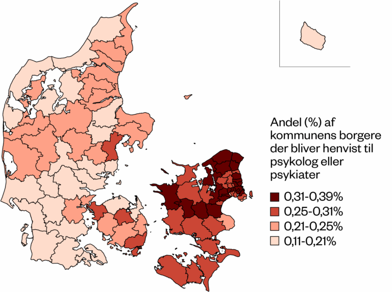 Og netop udbuddet af lokale specialister varierer meget: I nogle kommuner er der 1 psykolog pr. 10.000 borgere, mens andre kommuner har op til 35 psykologer pr. 10.000 borgere. Udbuddet af lokalt praktiserende psykiatere varier fra 0 til 10 pr. 10.000 borgere.