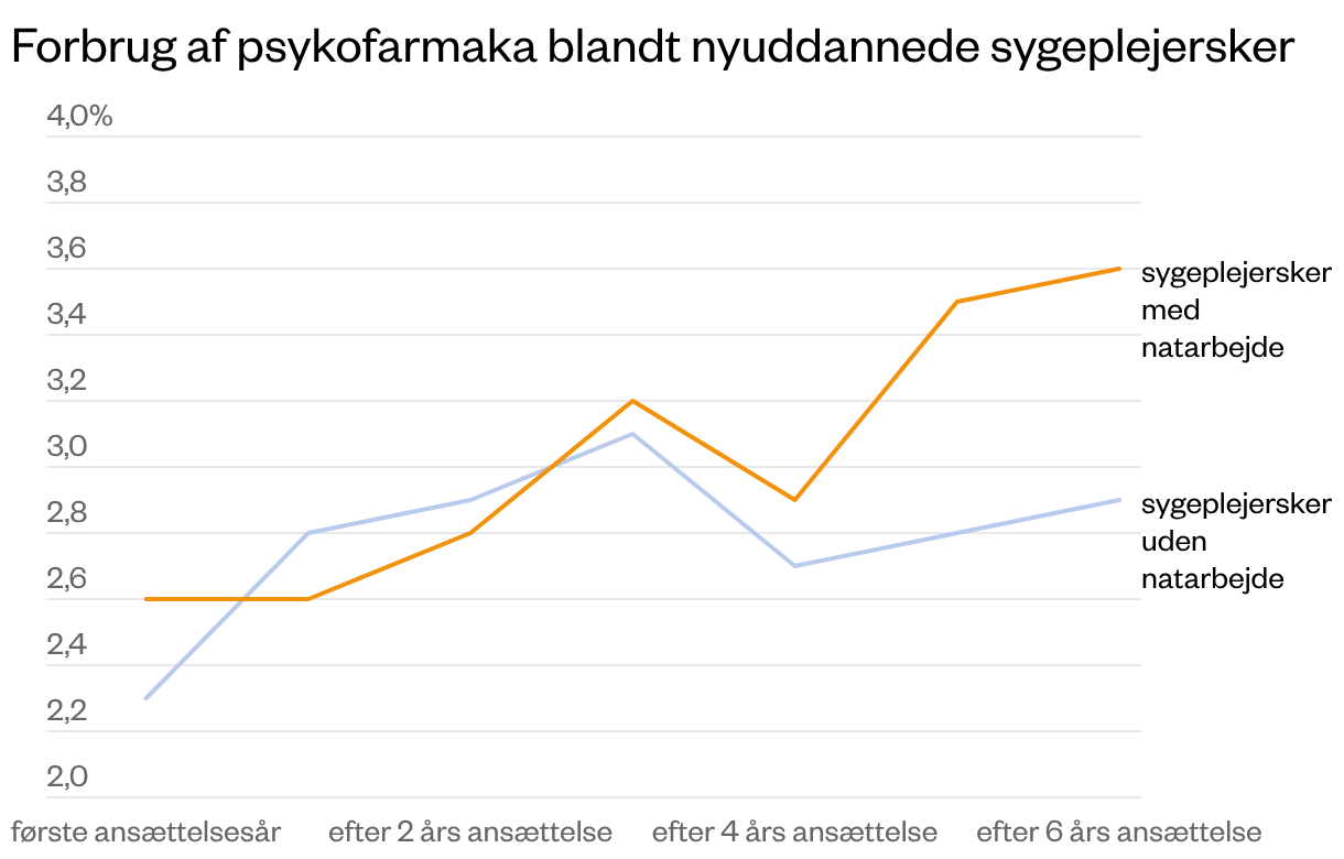 FIGURNOTE: Andelen af sygeplejersker, der indløser recepter på psykofarmaka, stiger år for år - både for sygeplejersker, der arbejder om natten, og for dem, der ikke gør. Stigningen er dog højere for dem, der arbejder om natten. 2-3% af sygeplejerskerne i denne undersøgelse tager medicin mod mentale helbredsproblemer i det første år, de er ansat på hospitalet. (Sygeplejersker, som havde et forbrug af psykofarmaka inden de blev færdiguddannet, er ikke med i undersøgelsen) For hvert efterfølgende år, de nyuddannede sygeplejersker har natarbejde, tager 24% flere af dem medicin mod mentale lidelser som stress, søvnbesvær, angst og depression. Kilde: Forskernes egne beregninger på data om sygeplejerskernes vagtplaner samt sundheds- og registerdata.