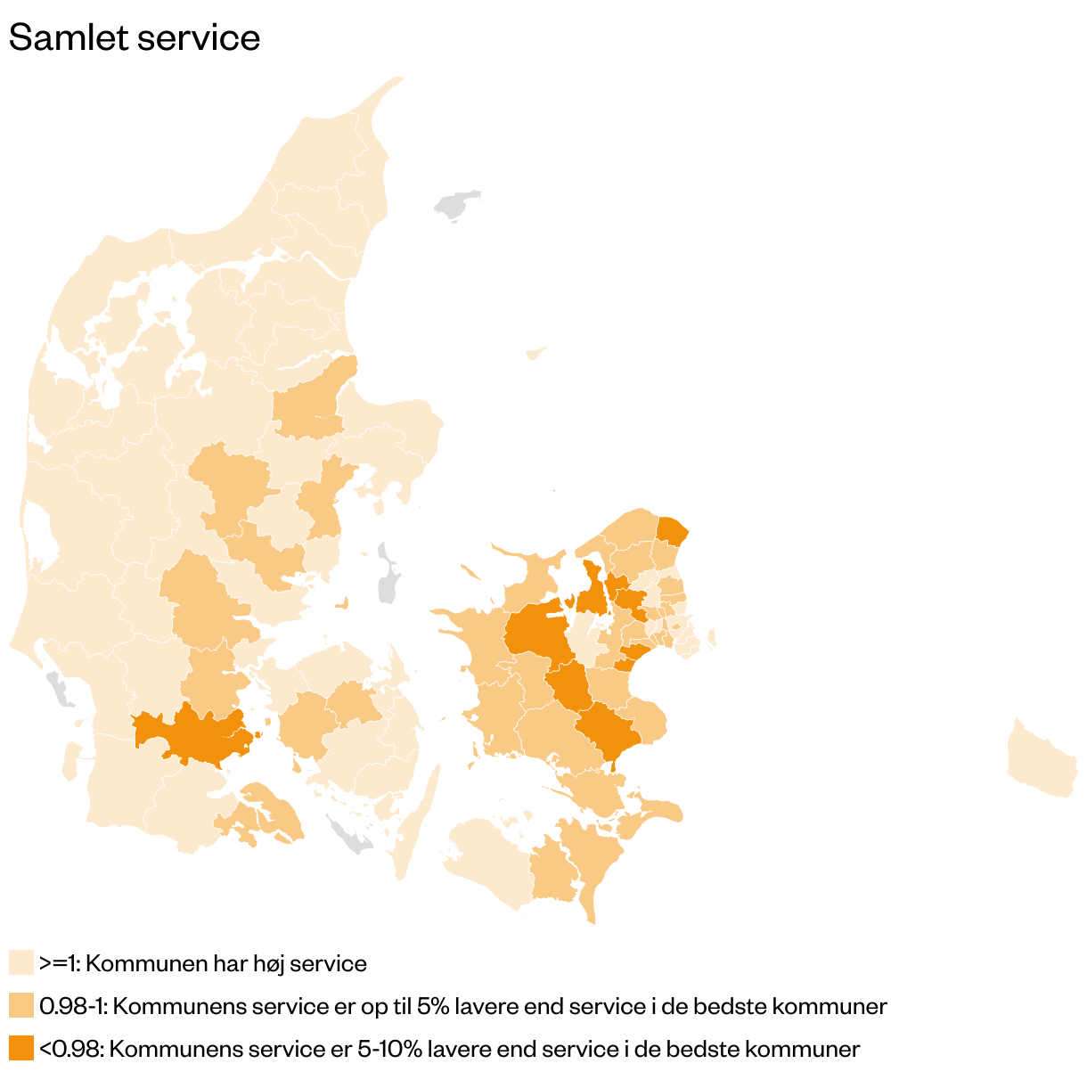 Blandt kommunerne med den bedste generelle service i perioden er kommuner som Lemvig, Allerød og Billund, mens den gennemsnitlige borger vil få væsentligt ringere service i kommuner som Faxe, Frederikssund og Gribskov. Og generelt modtager nordjyder væsentligt bedre kommunal service end borgere i Vest- og Sydsjælland.