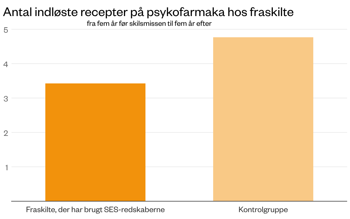 Over fem år havde de fraskilte mænd og kvinder, der anvendte det digitale værktøj, fået udskrevet 28% færre recepter for medicin mod psykiske problemer som fx. angst-, depression- og søvnlidelser sammenlignet med kontrolgruppen. Det lavere forbrug skyldes primært, at SES-brugerne indløste færre recepter for angstdæmpende medicin.