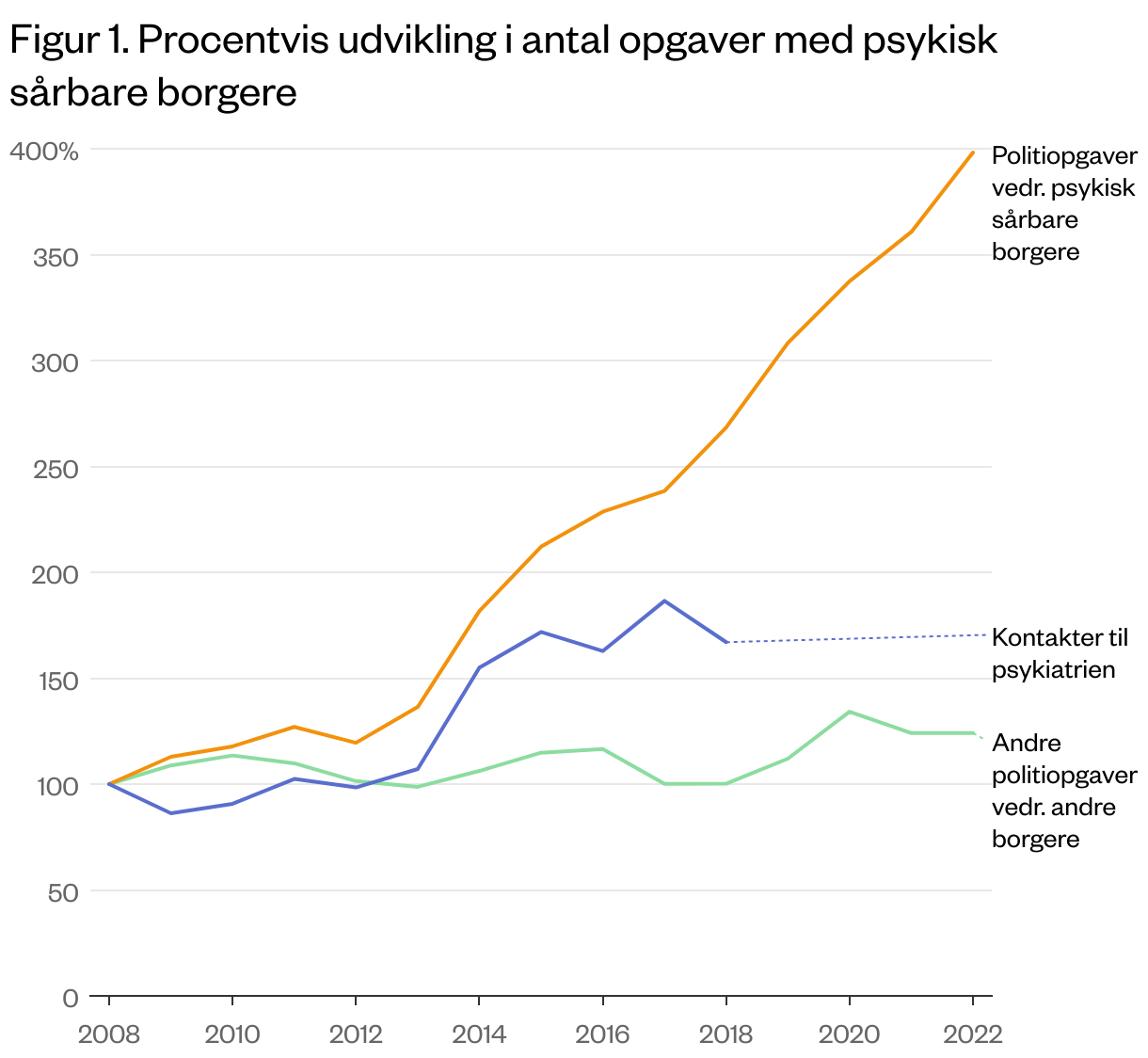 I 2008 havde dansk politi knap 12.000 opgaver, hvor politibetjente mødte og håndterede situationer, som de vurderede, handlede om en psykisk sårbar borger. I 2022 kunne man i Rigspolitiets sagsdatabase finde knap 48.000 opgaver af samme slags – altså en 4-dobling af den type opgaver på kun 15 år.