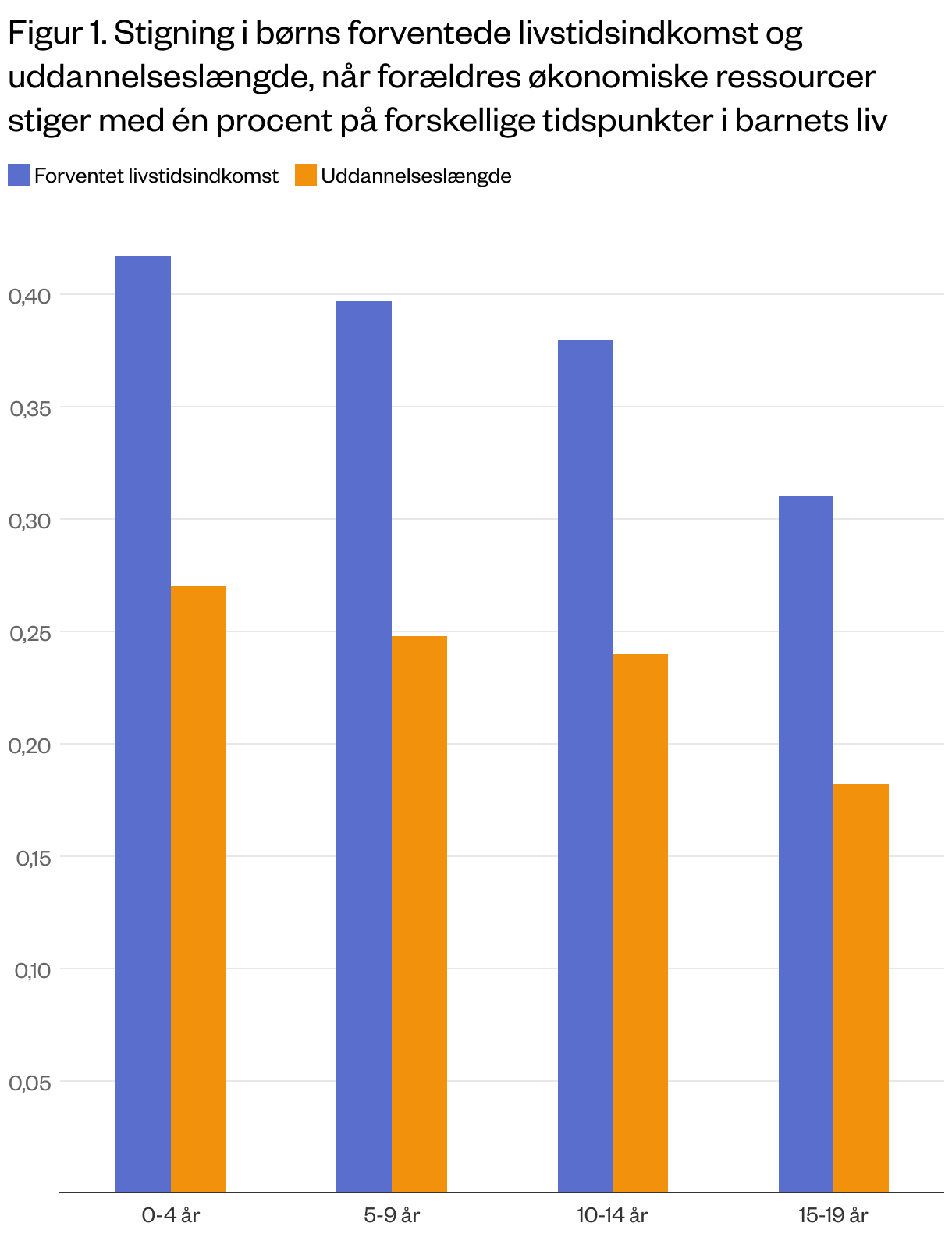 Effekten er mest tydelig, når forældrenes økonomiske ressourcer stiger, mens barnet endnu er lille eller tidligt i skolealderen (hhv. 0-4 og 5-9 år). For hver procent for-ældres økonomiske ressourcer stiger i denne periode af barnets liv, stiger børnenes forventede livstidsindkomst med ca. 0,4%.