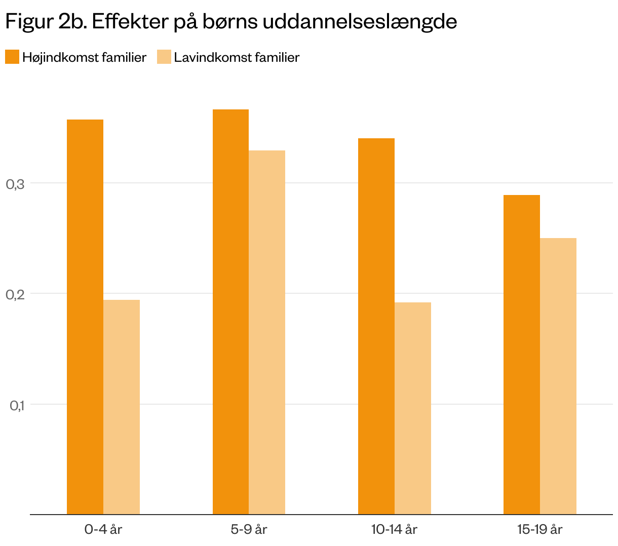 Forældres økonomiske ressourcer påvirker også børnenes uddannelse mere i højindkomstfamilier (mørke orange søjler) end det ses for alle familier i gennemsnit (jf. figur 1). De økonomiske ressourcer er vigtigst tidligt i barndommen og tidligt i skolealderen.