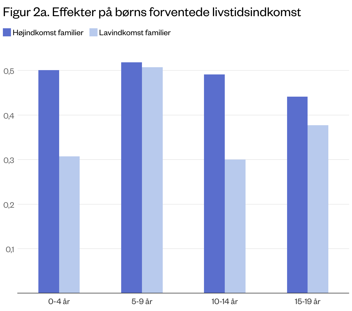 Betydningen af forældres økonomiske ressourcer for børnenes uddannelse og forventede livstidsindkomst gælder især for børn fra ressourcestærke hjem. Men effekten ses også i lavindkomstfamilier – især for de familier, hvor indtægtsstigningen sker, mens barnet er i indskolingsalderen.