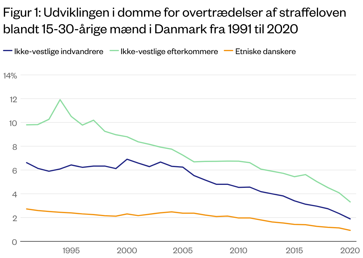 I Danmark er ikke-vestlige indvandrere og efterkommere overrepræsenterede i kriminalitetsstatistikkerne. Som vist på figur 1 er andelen af domfældelser blandt mænd mellem 15 til 30 år højest for ikke-vestlige efterkommere. I 1994 toppede den for denne gruppe med 12 procent, mens det i 2017 var faldet til 5 procent.