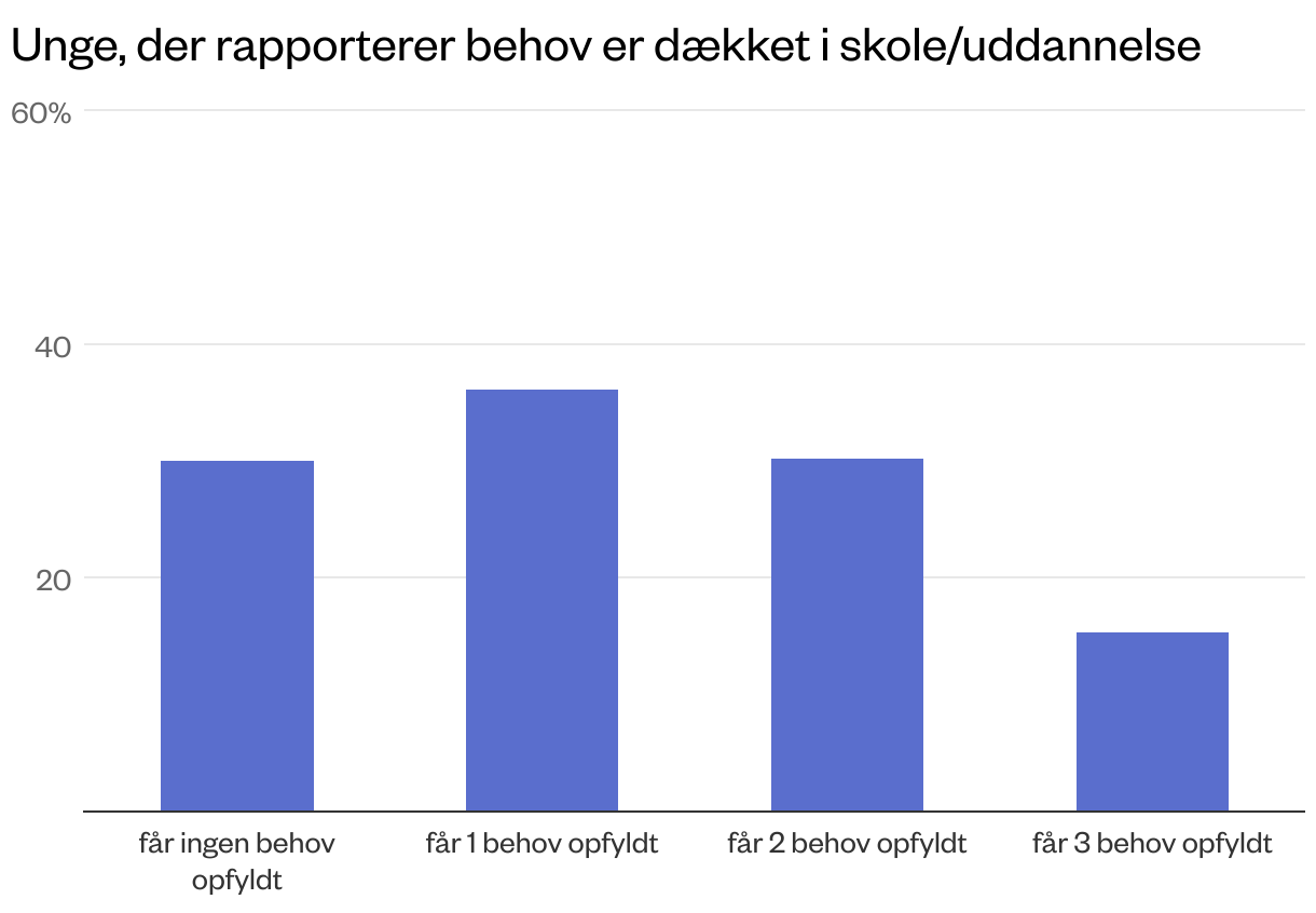 I skole-og uddannelsesmiljøet rapporterer kun 15% af de unge, at de får alle tre behov opfyldt, 30% melder om, at to behov er opfyldt, 36% føler, at kun et behov er opfyldt. Mens hele 30% af de unge siger, at i skolen eller på deres uddannelse, får de ingen af de centrale behov opfyldt.