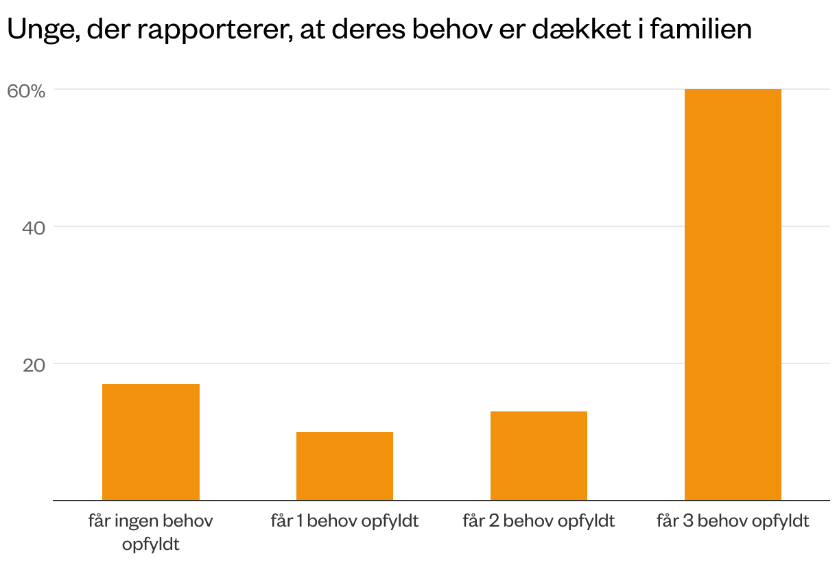 13 % af de unge rapporterer, at to af de tre behov er opfyldt, 10% at kun et behov er opfyldt og 17% angiver, at de slet ikke får opfyldt nogen af de tre centrale behov i deres familie.
