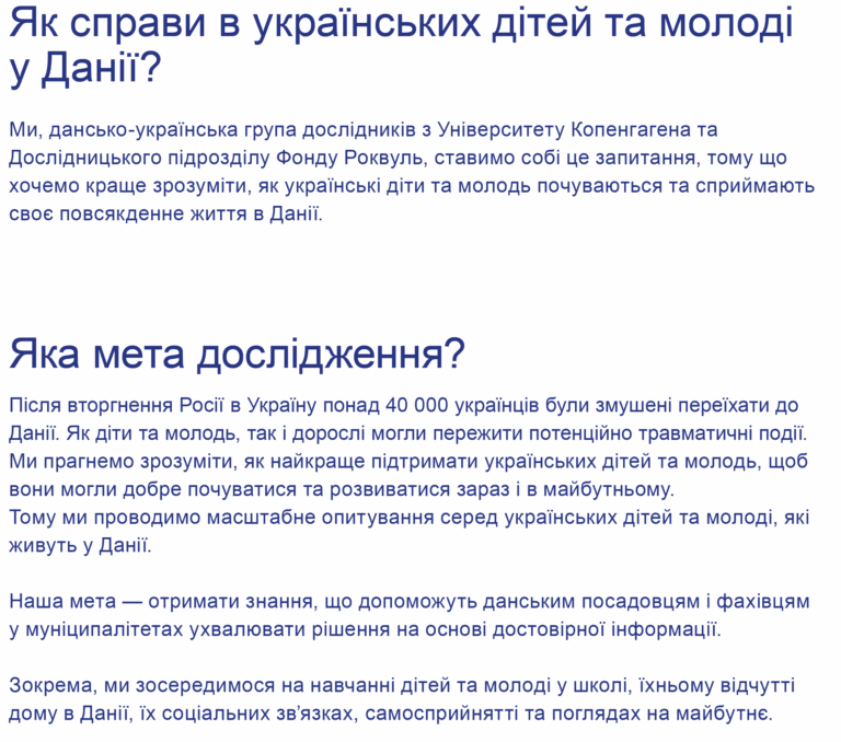 Det spørgsmål er vi, en dansk-ukrainsk gruppe af forskere fra Københavns Universitet og Rockwool Fondens Forskningsenhed, i gang med at undersøge. Vi vil gerne blive klogere på, hvordan ukrainske børn og unge har det og oplever deres hverdag i Danmark.