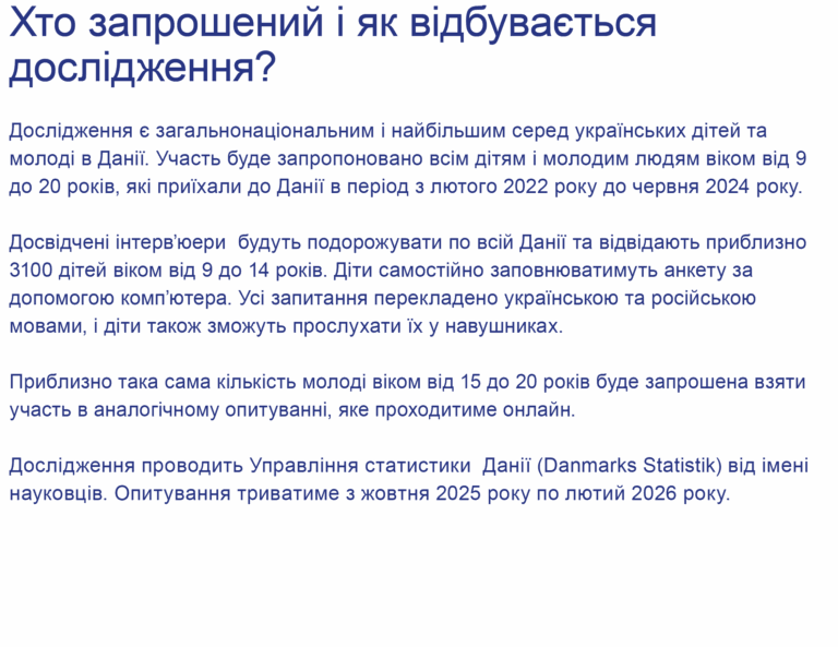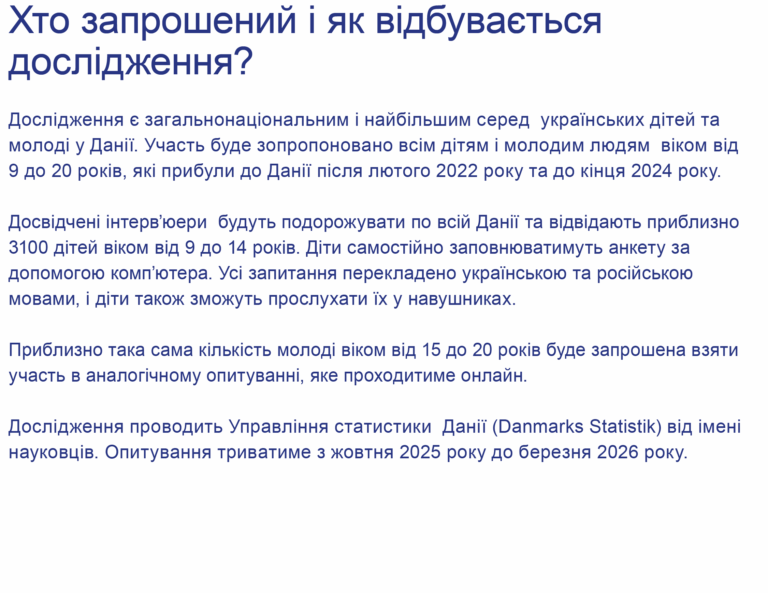Undersøgelsen er landsdækkende og den største blandt ukrainske børn og unge i Danmark. Alle børn og unge mellem 9 og 20 år, som er ankommet til Danmark mellem februar 2022 og juni 2024, bliver inviteret til at være med.