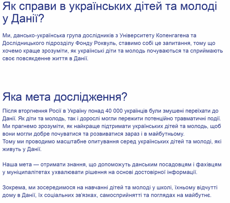 Vi vil gerne forstå, hvordan man bedst muligt kan støtte de ukrainske børn og unge, så de kan komme til at trives. Derfor gennemfører vi en stor spørgeskemaundersøgelse blandt ukrainske børn og unge i Danmark. Vores formål er at skaffe viden, så de danske beslutningstagere og praktikerne i kommunerne kan handle på et veloplyst grundlag.